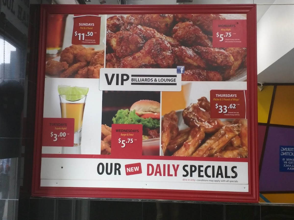 Welcome to VIP Billiards & Lounge, your go-to destination located at 842 College St, Toronto. This vibrant establishment is renowned for its lively atmosphere, making it a perfect spot for gatherings, whether casual or celebratory. The menu offers a delightful array of choices, featuring Pint & A Pound specials and enticing entries like the Ensalada De Mar and Pulpo A La Parrilla priced at $35.00.